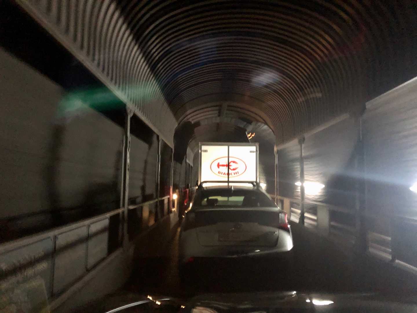 カーフェリー⛴に乗る時と同じ要領で車は一列に並ばされ、剥き出しの貨物列車みたいな台車の上に、ガソリンスタンドの洗車機に入れるような感覚で、恐る恐る車を乗せる。。